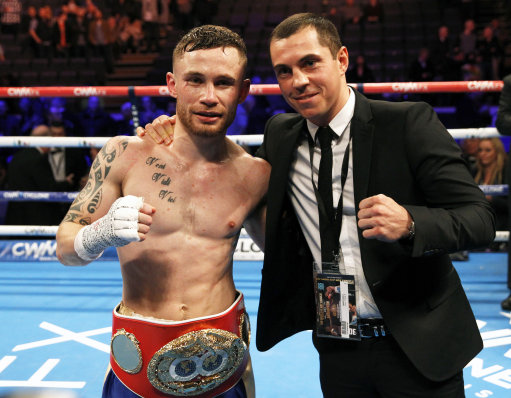 IBF world champion Carl Frampton, left, poses for a photo with WBA world super bantamweight champion Scott Quigg after defeating Chris Avalos of the U.S. during their IBF super bantamweight world boxing title fight at the Odyssey arena in Belfast, Northern Ireland, Saturday, Feb. 28, 2015. (AP Photo/Peter Morrison)