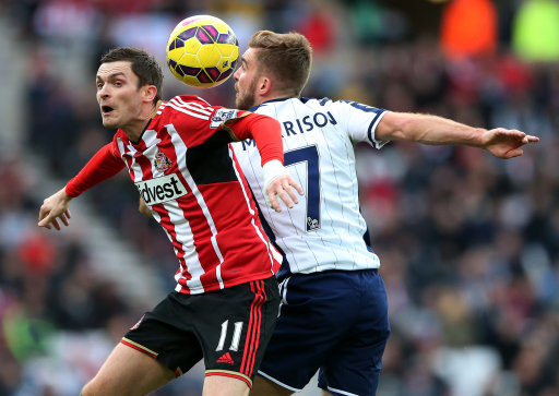 Sunderland’s Adam Johnson, left, vies for the ball with West Bromwich Albion’s James Morrison, right, during their English Premier League soccer match between Sunderland and West Bromwich Albion at the Stadium of Light, Sunderland, England, Saturday, Feb. 21, 2015. (AP Photo/Scott Heppell)