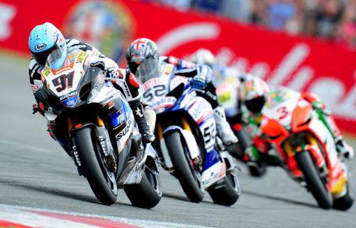 Team Suzuki Alstare’s Leon Haslam (left) of Great Britain comes out of Luffield followed by Yamaha Sterilgarda Team’s James Toseland of Great Britain during the British Grand Prix at Silverstone, Northampton.