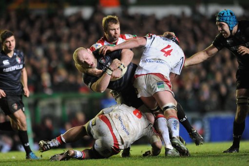 Leicester Tigers’ Dan Cole is tackled by Ulster Rugby’s Roger Wilson, Nick Williams and Johann Muller during the Heineken Cup, Pool Five at Welford Road, Leicester.