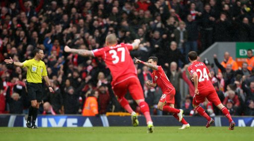 Liverpool’s Philippe Coutinho celebrates scoring his side’s second goal of the game during the Barclays Premier League match at Anfield, Liverpool.