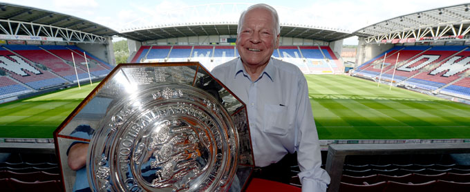 Wigan Athletic chairman Dave Whelan looks at the Charity Shield, during the photocall at the DW Stadium, Wigan.