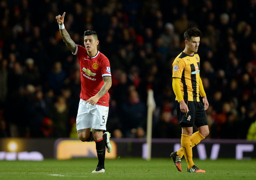 Manchester United’s Marcos Rojo (left) celebrates scoring his side’s 2nd goal as Cambridge United’s Ryan Donaldson looks dejected during the FA Cup, Fourth Round replay at Old Trafford, Manchester. PRESS ASSOCIATION Photo. Issue date: Tuesday February 3, 2015. See PA story SOCCER Man Utd. Photo credit should read: Martin Rickett/PA Wire. RESTRICTIONS: Editorial use only. Maximum 45 images during a match. No video emulation or promotion as ‘live’. No use in games, competitions, merchandise, betting or single club/player services. No use with unofficial audio, video, data, fixtures or club/league logos.